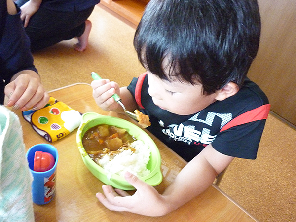 完成した大鍋カレーを見て「いっぱいすごいね!」と子どもたち。みんなで美味しく食べました。「自分で取ったじゃがいもおいしいねー」と親子でニコニコ。笑顔あふれる交流会となりました。