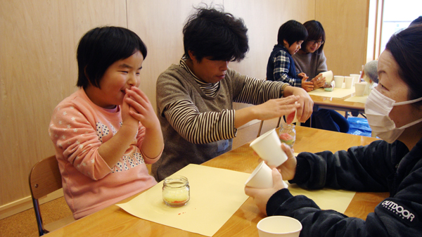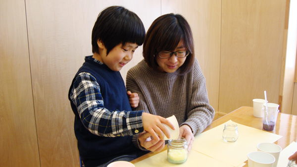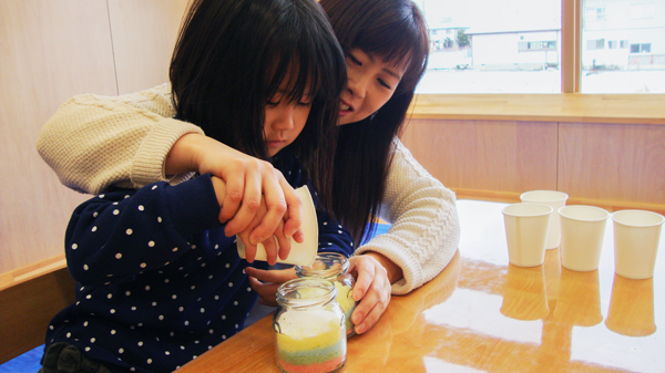塩キャンドル作りでは、お父さんお母さんといっしょに、みんなで赤、青、黄、緑・・・とそれぞれ色のついた塩をガラス瓶の中に入れていきました。完成したオリジナル塩キャンドルに「できた!」とみんなは大喜び!