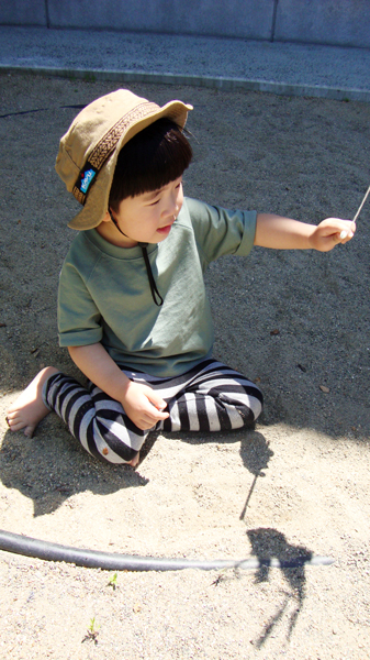 子どもたちは、庭で裸足になり遊びました。