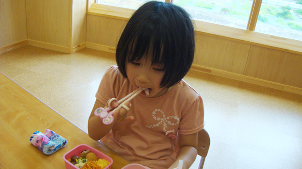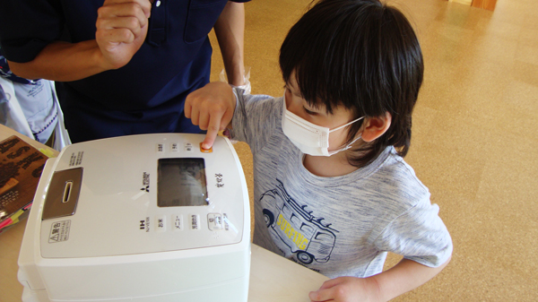 昼食では、自分で炊いたごはんを食べて「おいしい!」とニコニコの子どもたち。