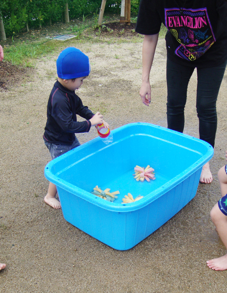 お庭の中では、おもちゃのスポンジを握って手の体操をしたり、ペットボトルの水鉄砲を使ってみたりして楽しく遊びました。