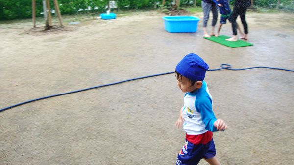 水泳帽をかぶり、タオルなどの自分の荷物を持ってお庭へ行きました。