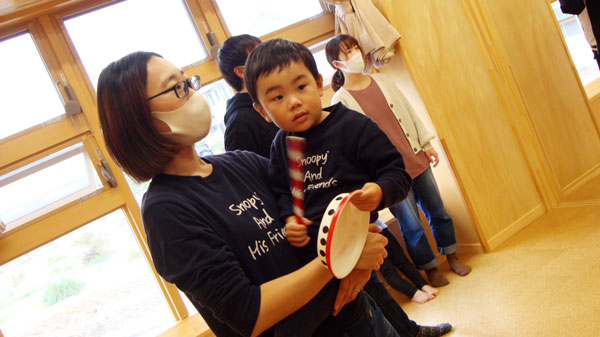 腕を大きく動かして、大きな音や小さな音の違いを聞いたり、歌をよく聞いて歌に合わせて叩いたりと、腕と耳をたくさん働かせて楽しみました!