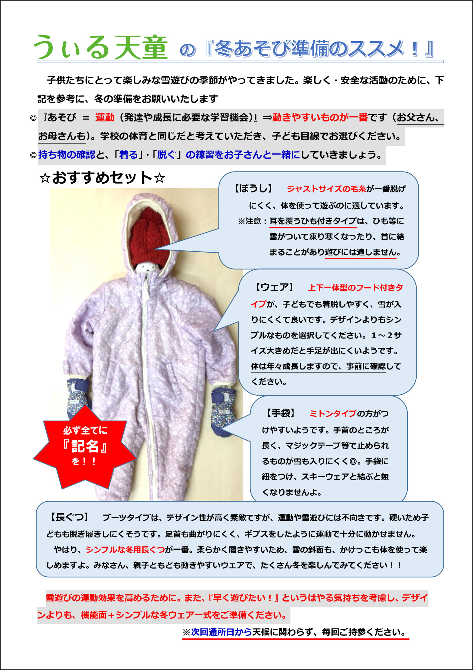 その冬を『安心・安全』に楽しむためには備えが大事です。『冬あそび準備のススメ!』をご確認いただき、用意ができれば次回通所からご持参いただけますようにお願いいたします。また、保護者の方も活動時は動きやすい服装と帽子、手袋を必ずご持参ください。ご理解とご協力をお願いいたします。