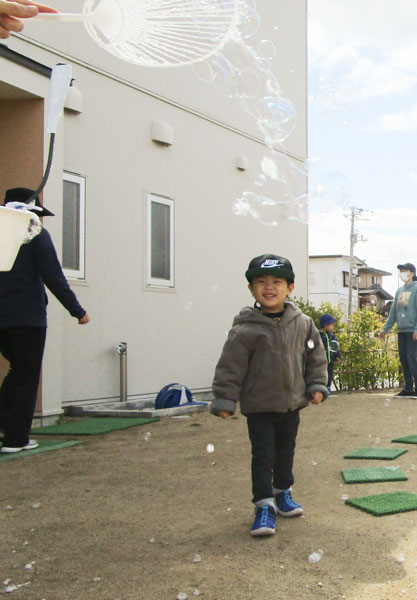 母子活動では、お庭や公園に行きました。シャボン玉を追いかけたり、自分で飛ばして遊びました。