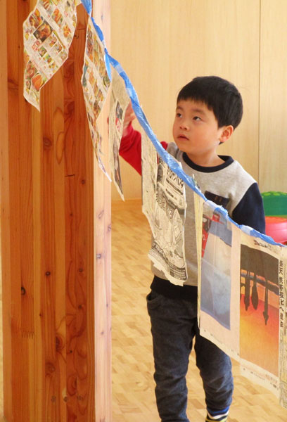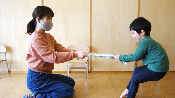 新聞紙がちぎれても、もう一度チャレンジ!「勝ったよ~!」と両手挙げて喜ぶ子どもたちでした。