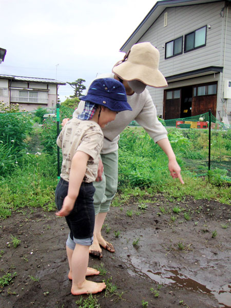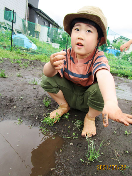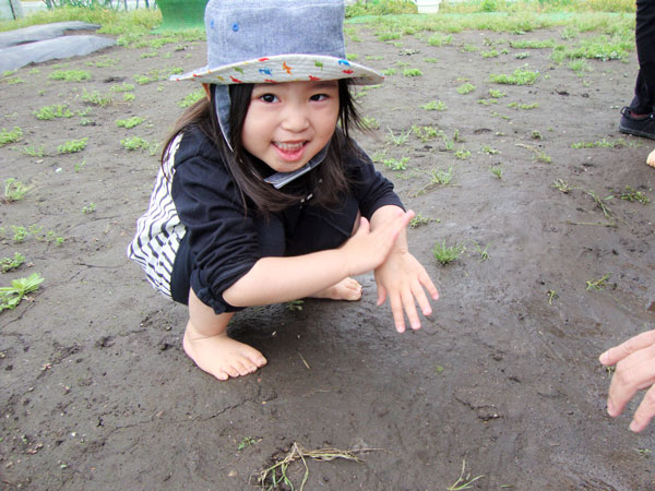 泥を手や足で触れてみたり、泥に足を入れてみたりして、感覚遊びを楽しみました。