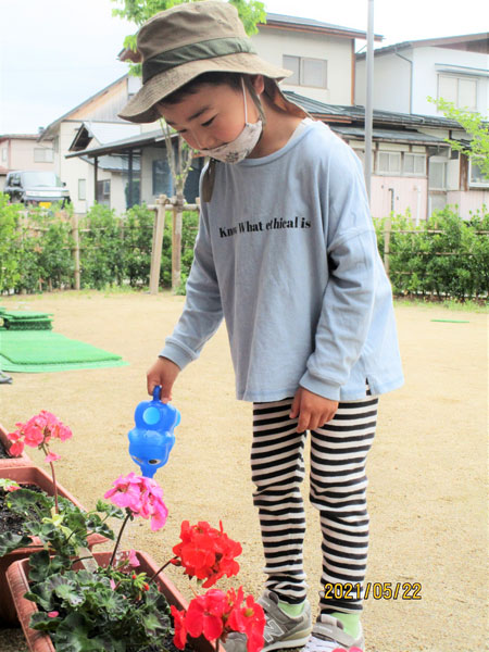 赤やピンクなど、色鮮やかに咲いているお花に、子どもたちは興味津々!「お花、大きくなあれ!」とお願いしながらお水をかけました。