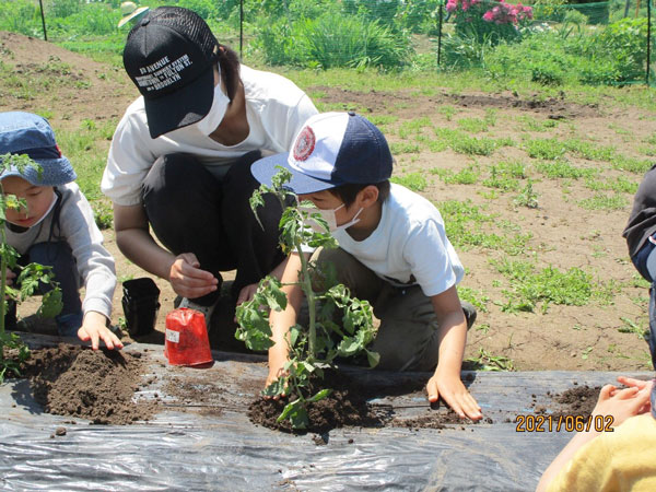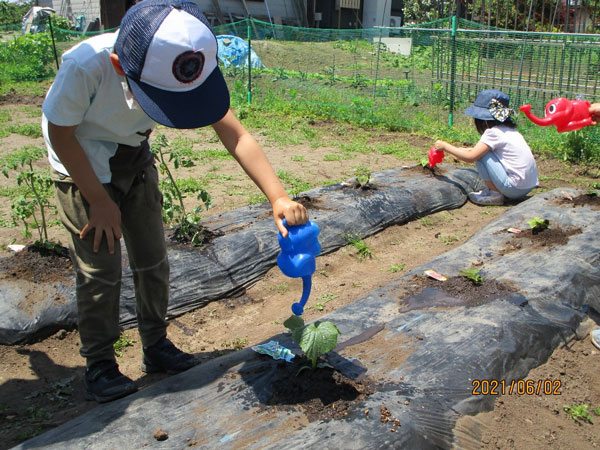 6月の晴れた日に、畑に野菜の苗を植えました。植え方のお話をしっかり聞いて、みんなでトライ!今年はきゅうりとトマトとさつまいもです。