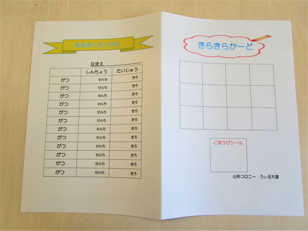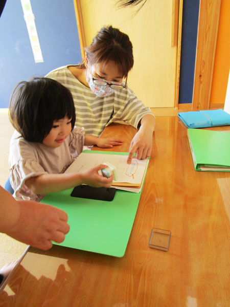 選択型土曜開所を6月5日に行いました。今回も月初めの身長体重測定を行いました。測定後はきらきらかーどに記録し、自分で『できたねスタンプ』を押しました。