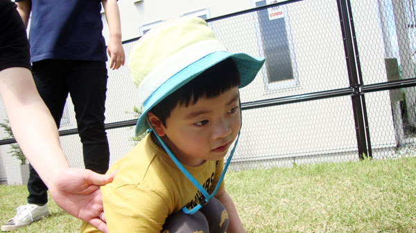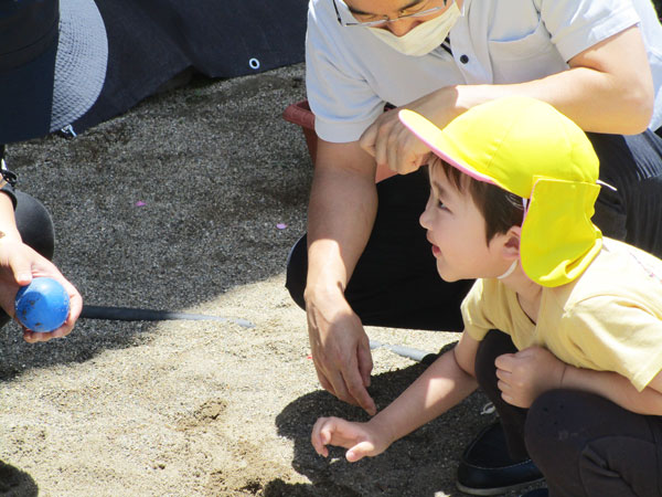 お庭では砂場遊びをしました。サラサラの砂や湿った砂を触ってみたり、穴を掘ってみたりとニコニコで砂の感触を楽しみました。