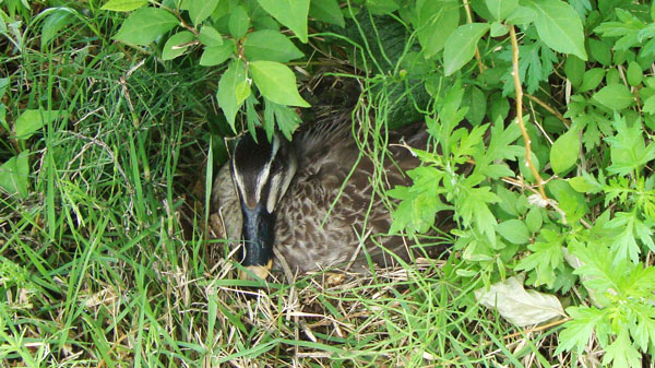 公園で遊んでいたお友達が何かを見つけたよ!・・・カモを発見!卵を温めているようです。