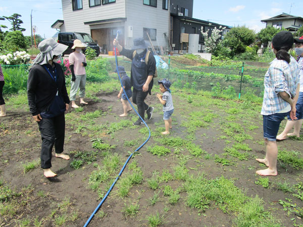 畑ではどろんこ遊びと、野菜の苗にお水をかけてくれました。シャワーから出るお水を全身で浴びたり、はだしになって泥の上を歩いたりしました。