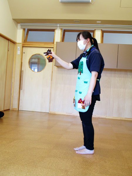お部屋に戻り、紙人形劇とエプロンシアターを見ました。いつもの絵本とは違い、人形や絵が飛び出てくるお話に、みんな真剣な表情で見入っていました。