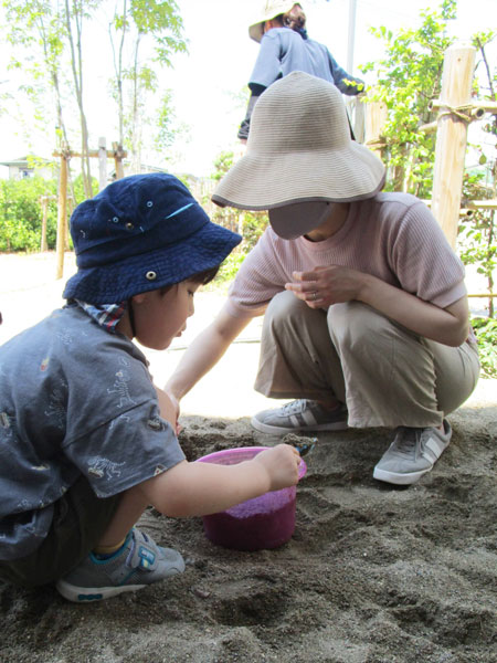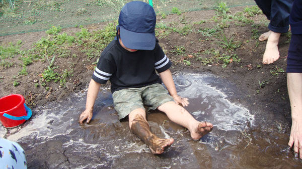 お庭でキラキラ光るしゃぼん玉に目を輝かせてしゃぼん玉を追いかけたり、野菜に水かけをしたり、どろんこプールに入ったりして、水や泥の感触を味いました。