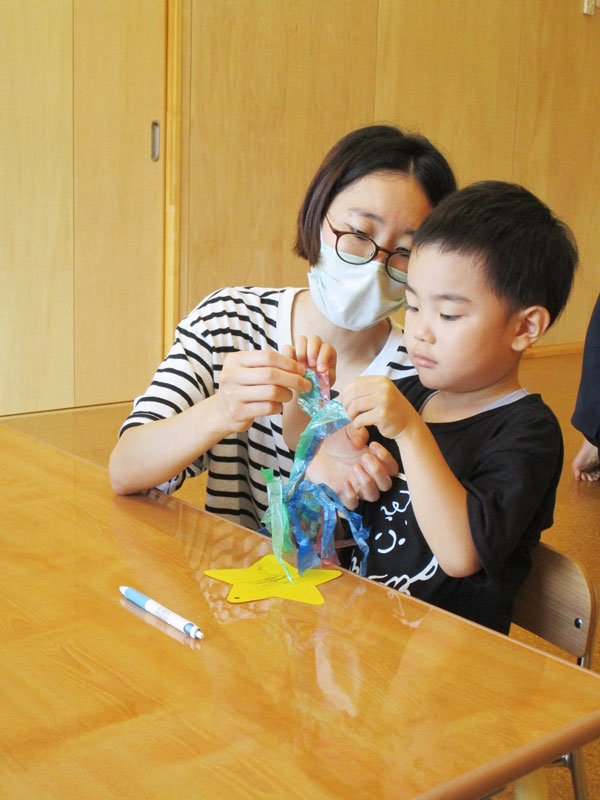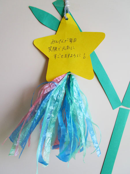 青、緑、赤のすずらんテープを、指先を使って丁寧に裂きました。短冊はお家の方と一緒に笹飾りにつけて、お空にお願いを・・・。