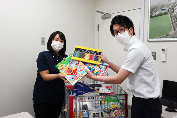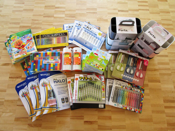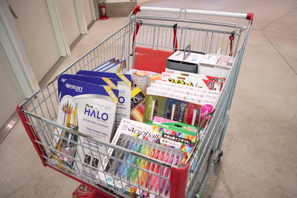 寄贈のお話をいただき、コストコかみのやま倉庫店へ。カートいっぱいにクレヨンや色鉛筆、折り紙、のりなど、用意してくださっていました!