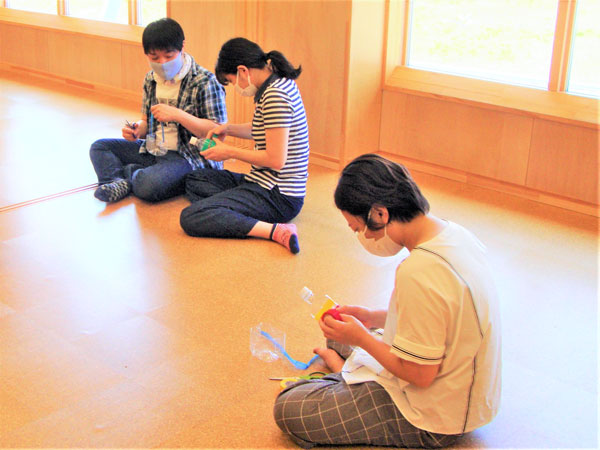 その後、ご家庭でも簡単に作れるおもちゃを作りました。今回はプール活動で使用するペットボトルシャワーを作って頂きました。