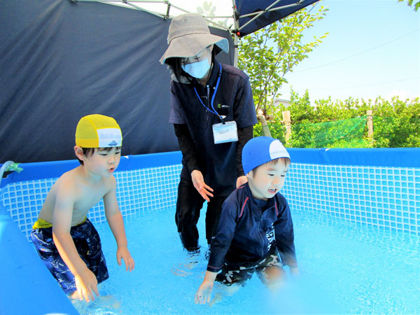 絶好のお天気の中、子どもたちは水を触ったり、水の中を歩いてみたり、シャワーの水を浴びたり元気いっぱい!たくさんの笑顔が見られました!