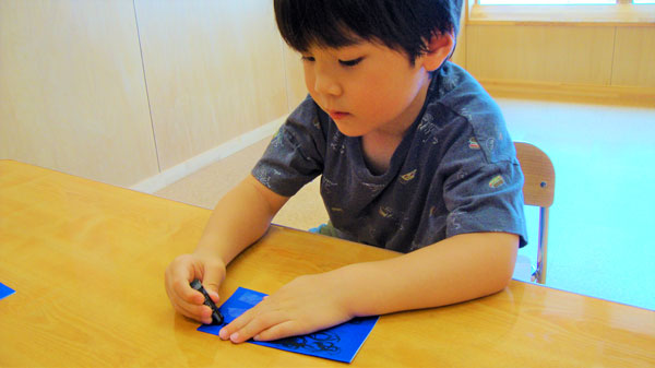 ミーティング後、パパママと一緒に折り紙とストローでストローロケットを作って遊びました。折り紙に思い思いの絵を描き、テープをつけて完成!ストローを吹く遊びに興味深々!