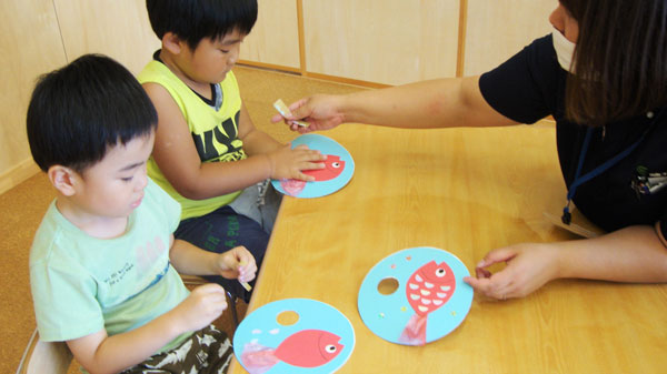 手や指をたくさん使って、お魚を貼ったり、好きなところにうろこやキラキラ星のシールをぺったん!