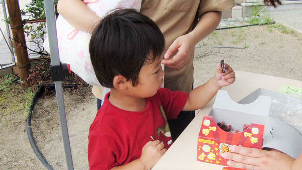 最後にご褒美の駄菓子や花火のセットを自分で一つずつ選びました。「どうぞ」「ありがとう」のやりとりもバッチリ!