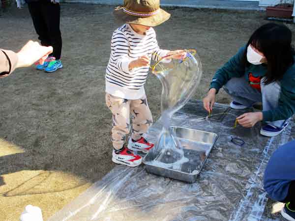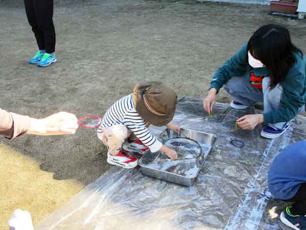 子ども達が自分でできるように、持ちやすいモールの輪っかや、すぐに割れないしゃぼん液でたくさん遊びました✨