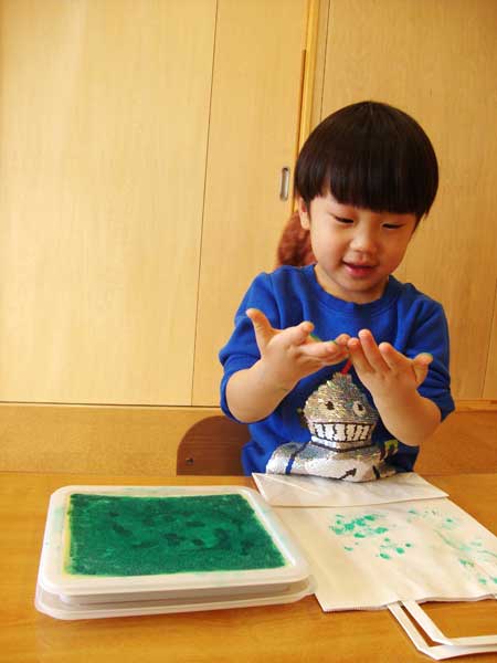 手形スタンプや、指先で物をつまむ感覚、シール貼りなど様々な感覚を味わって楽しみました。
