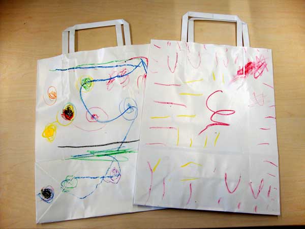 お店の前に飾る看板、お買い物バッグ、おもちゃ作りをしました。