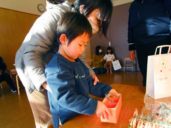 おもちゃとおかしはいろんな種類から自分で選んで、バッグにしまいます。