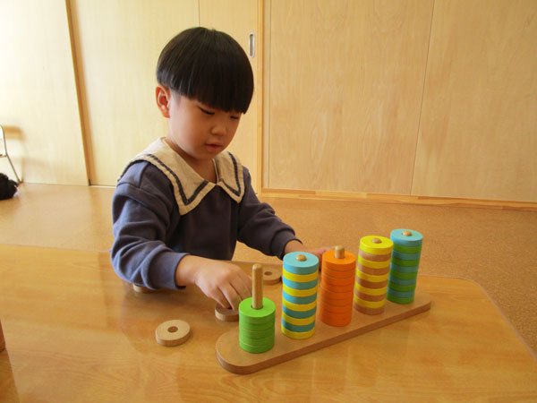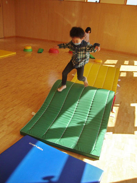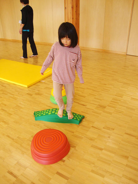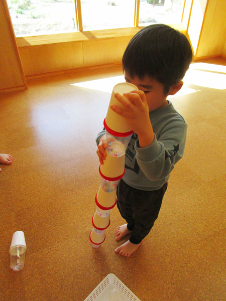 他にも、ビーズマラカスやドーナツ積み木を重ねて遊びながら、手や指をたくさん動かしました!バランス遊びやマット遊びでは、全身を動かして体づくりをしました!