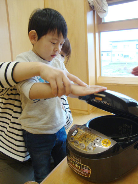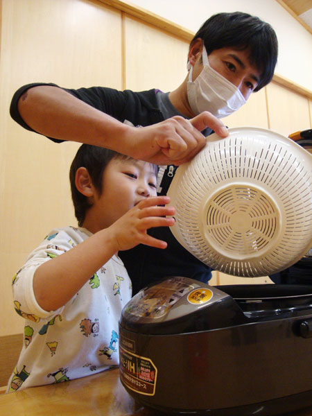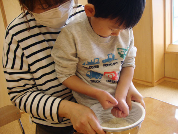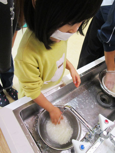 まずは、親子で米とぎ体験をしました。水を入れる前のさらさらのお米を触ってから水を入れて、感覚の違いを楽しみながら米とぎをしてみましたよ。