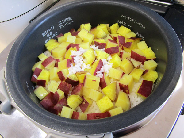 といだお米と切ったさつまいもを炊飯器に入れて、スイッチオン♪