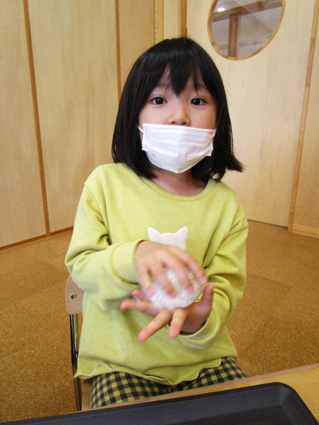 今回は、“おにぎりができるまで”の工程を一緒に体験してみました。米の触感の違いや作る流れを見たり・聴いたり・触れたりしながら知ることができました。今後もいろいろな気づきや発見が体験できるような遊びをしていきたいと思います♪