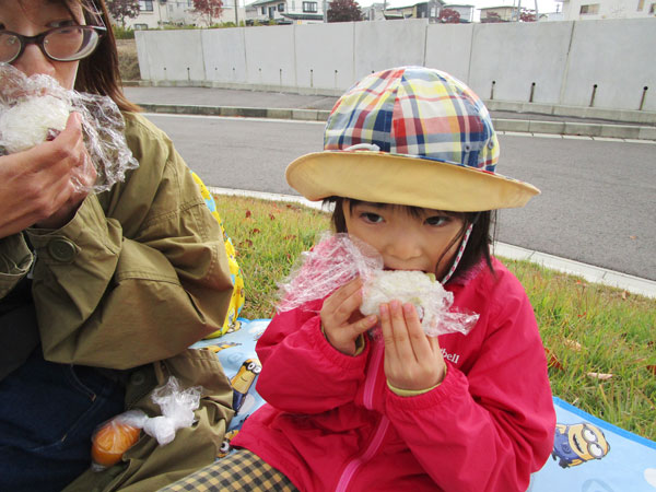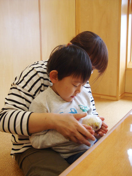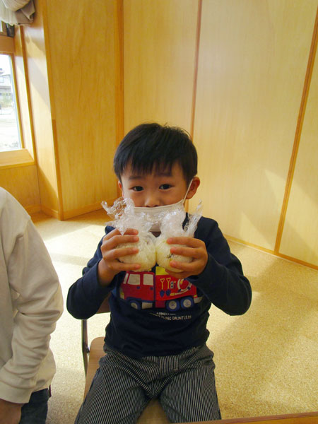 自分で作ったさつまいもおにぎりを大事そうに持って見せてくれましたよ!普段、混ぜご飯や白ご飯をあまり口にしないお子さんでも、自分でといだ米で握ったおにぎりを「おいしい!」と食べられたり、嬉しそうに見ていたりと微笑ましい様子がみられました。
