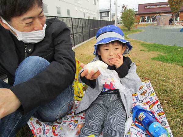 リュックにおにぎりを入れて、戸外に出発!公園やお庭でそれぞれレジャーシートを敷いてピクニックを楽しみました♪