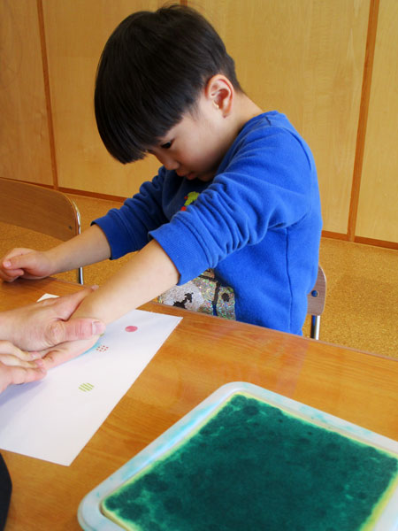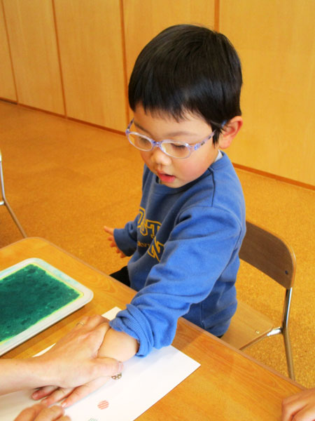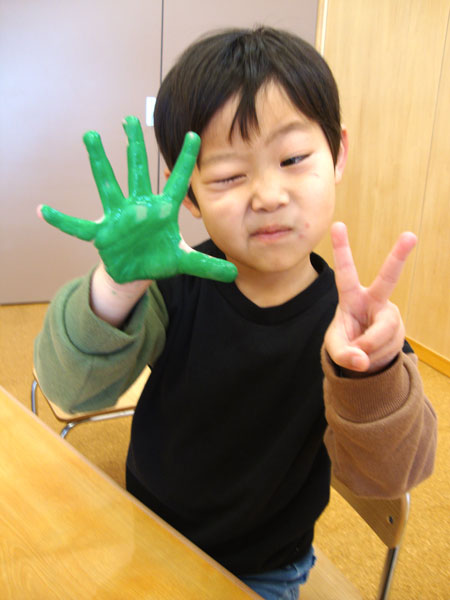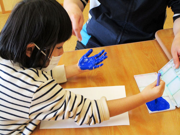 絵の具を触ってみたり、筆で手に絵の具を塗ってくすぐったい感覚を楽しみました!