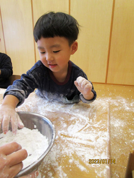 初めて触るだんご粉で真っ白になっているお友達も発見!