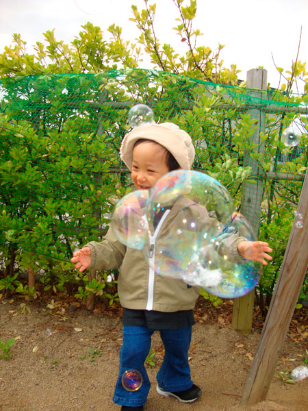 戸外活動では、穏やかな風の中ふんわりと漂うシャボン玉を追いかけ、活動を始めた虫たちを、しゃがんで指で差しながら追いかけて楽しみました。