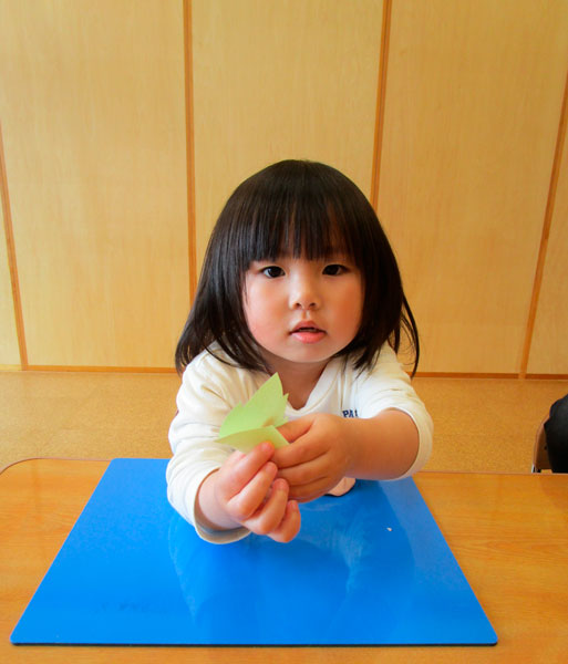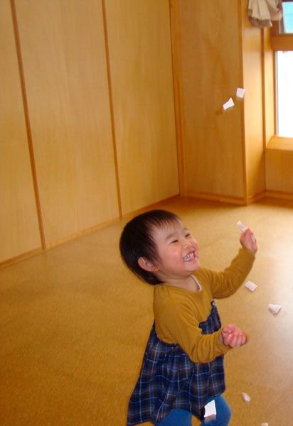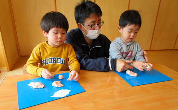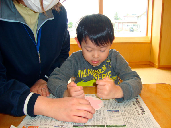 その後は、桜色の紙を手で小さく小さくちぎり「桜吹雪ごっこ」を楽しみ、桜色の粘土を掌でころころ転がし、桜餅づくりに見立てた粘土あそびをたっぷり楽しみました。