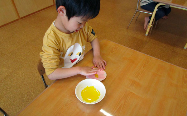 桜の花の真ん中に指で「ちょんちょん」と色付け、クレヨンで書いてみたりとぼくの・わたしの世界に一つのオリジナルコースターの出来上がりです。