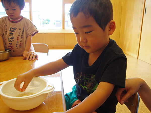 はじめは乾いたお米と濡れたお米に直接触れ、感触の違いを楽しみました。