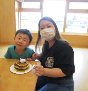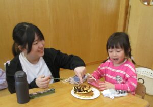 会食タイムでは「おいしいね」「お家でも作りたい!」と嬉しい声が聞こえてきました。親子で食べる愛情たっぷりのホットケーキの味は格別ですね♡