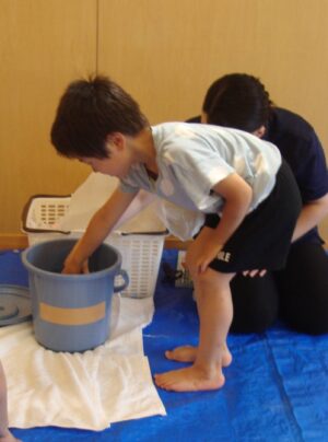 自分で選んだ絵の具の色で水の色が変わることに目をキラキラさせる姿や、自分の手に絵の具をペタペタ塗って喜ぶ姿が見られ、色遊びを楽しんでいました。