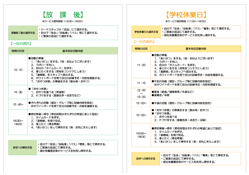 | 営業日 | 原則: 月曜日~金曜日(土曜日開所の日もあります) |
